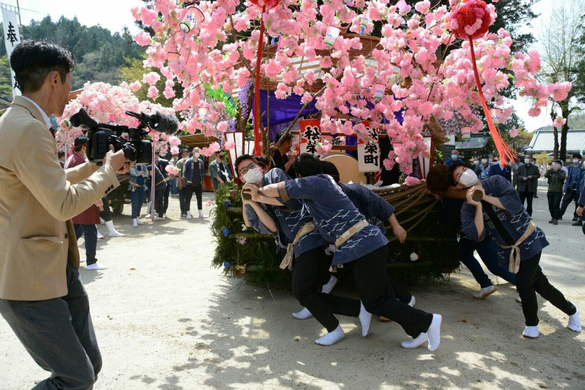 遠くに下の町からも太鼓の音が響いてくる。お囃子を邪魔しないようにと、千代園さんは耳をそばだて、風にのって運ばれてくる太鼓の音に注目した。目標の4時が近づくころ、次第に太鼓の音が小さくなった。町にいる方に電話で確認し、花車が出発するタイミングを見計らい千代園さんの演奏が始まった。