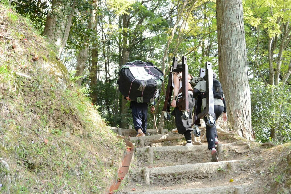 現代の足の神様が和太鼓を山頂まで運ぶ