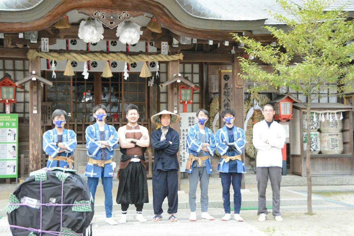神社につくとちょうど、花車を片付け終わった町の若い衆の皆さんと合流。記念撮影をさせていただく。
