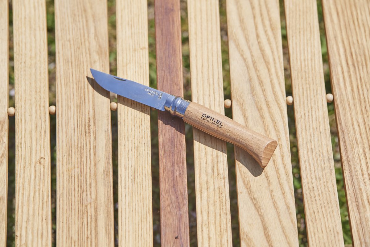オピネルの折り畳みナイフは、ステンレスとカーボンの2種があるが、錆びにくいのは圧倒的に前者。使用後は水分や汚れをしっかりとふき取り、よく乾かすことで良いコンディションを保つことができる。筆者も10年近く愛用しているが錆び知らずだ。ものぐささんはステンレスで決まり!