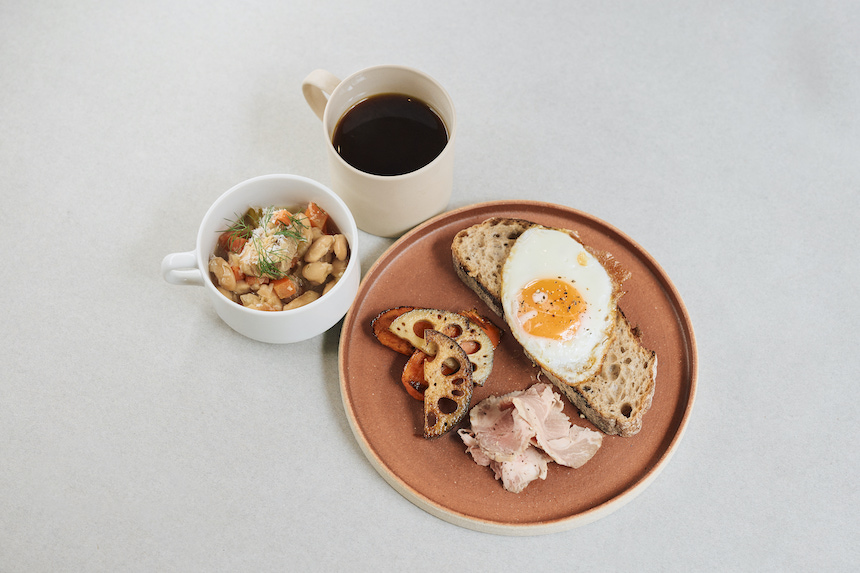 カフェにはオリジナルの自家焙煎コーヒーのほか、季節の無農薬・有機野菜を使ったモーニングプレートも。また、バー&ダイニングでは山梨・長野で醸造されたナチュラルワインやクラフトビール、そのほか季節や土地に合わせた料理を楽しむことができます。