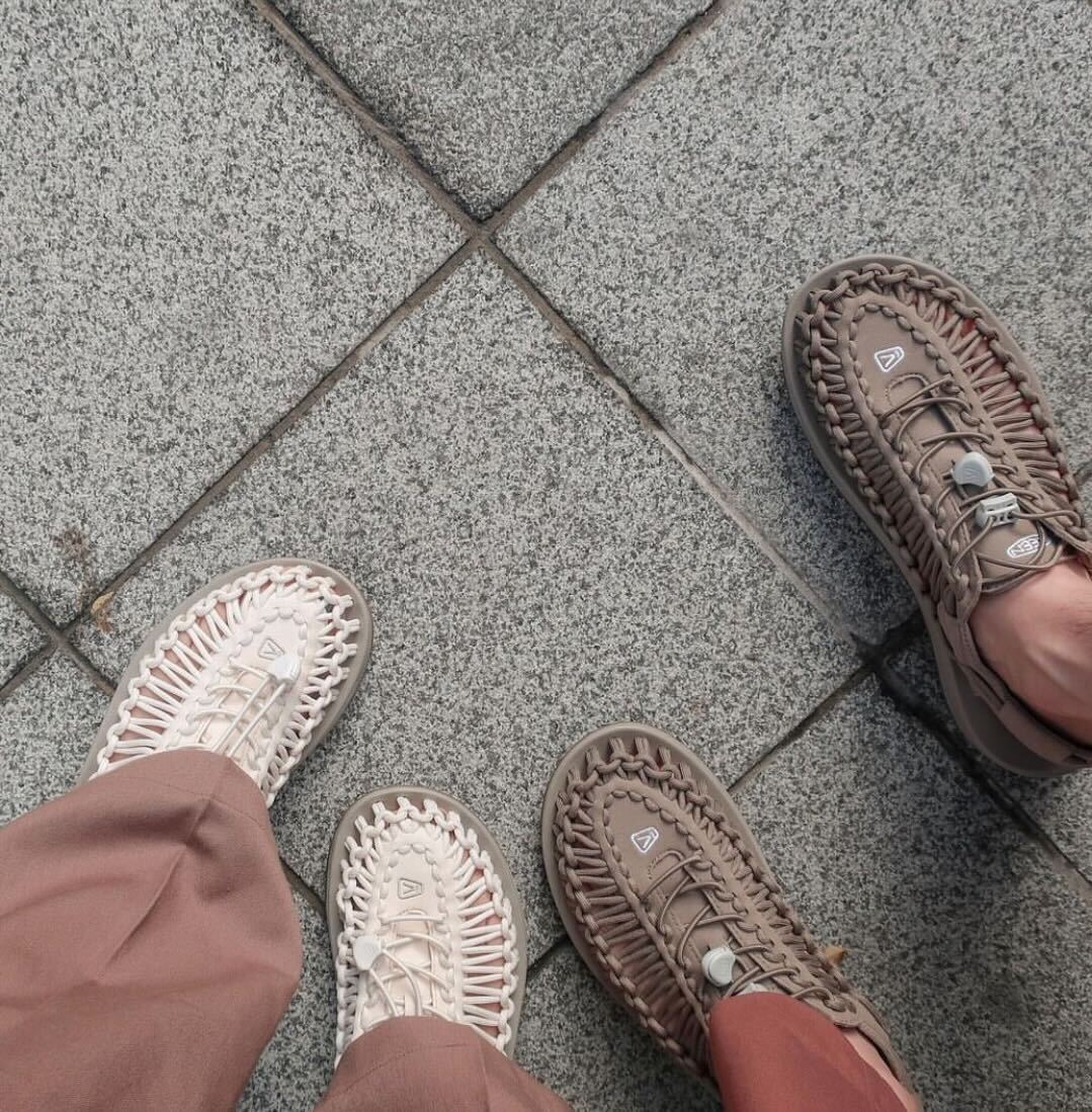 夫婦で色違いのキーンのサンダルを使ってのコーディネート◎