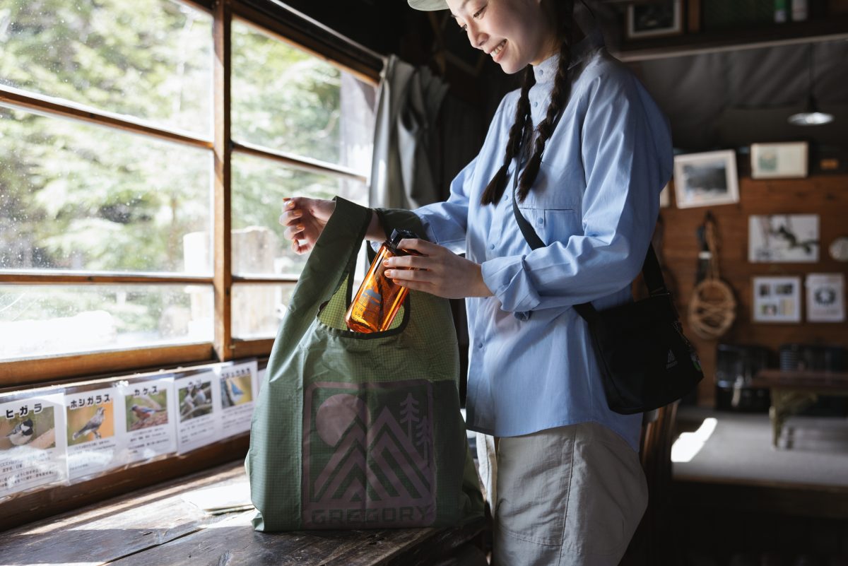 山小屋で過ごす時間にはエコバッグが便利です。読みかけの本やドリンク、おやつを「イージーショッパー」に入れて、みどり池の前に行こう