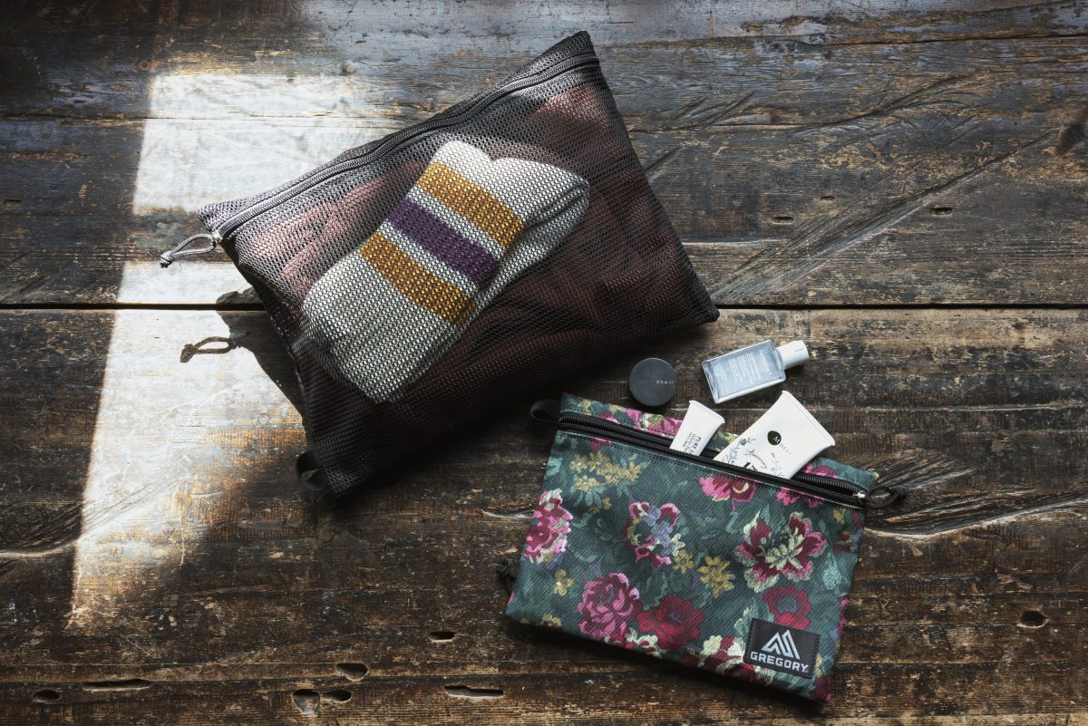 細かい必需品はポーチに整理して収納。「エンベロップポーチ(左:A4、右:B5)」など、グレゴリーは旅で役立つさまざまな収納小物も充実しています。