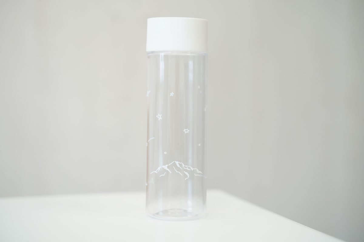 容量は160ml。片手に収まるサイズ感のボトルに描かれているのは、ランドネ編集部と佳美さんが大好きな、日向山から見た甲斐駒ヶ岳です。描かれた風景は、麦茶などの色付きドリンクを入れたり、空にかざすと表情を変えて楽しめます。ミックスナッツやグミなど、お気に入りの行動食入れにするのもおすすめです。
