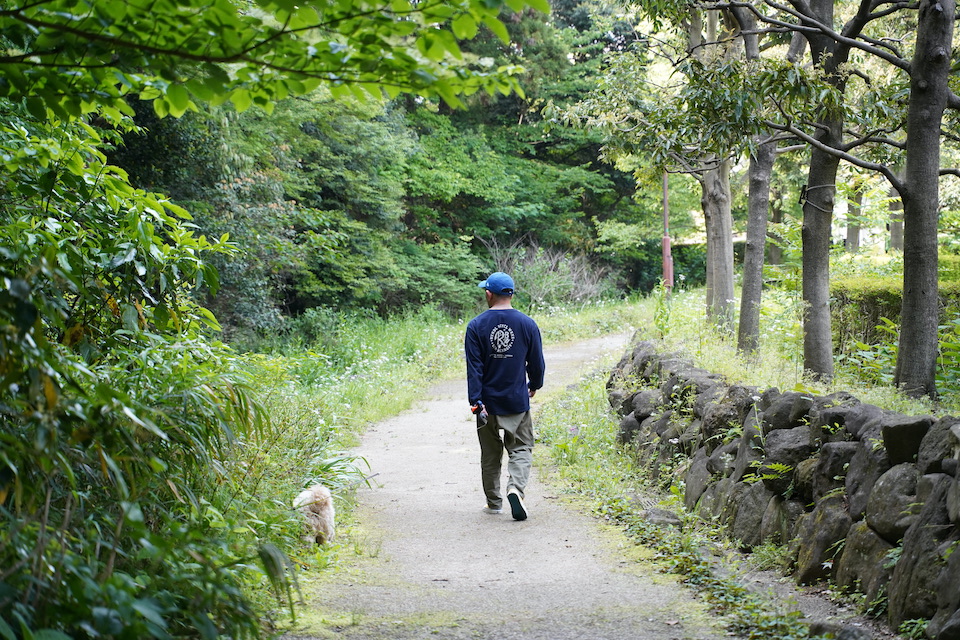 ▲朝晩は犬とお散歩をしている。普段から自然のなかに身を置き、作品のイメージを膨らませたり、遊びの企画を考えたりしている