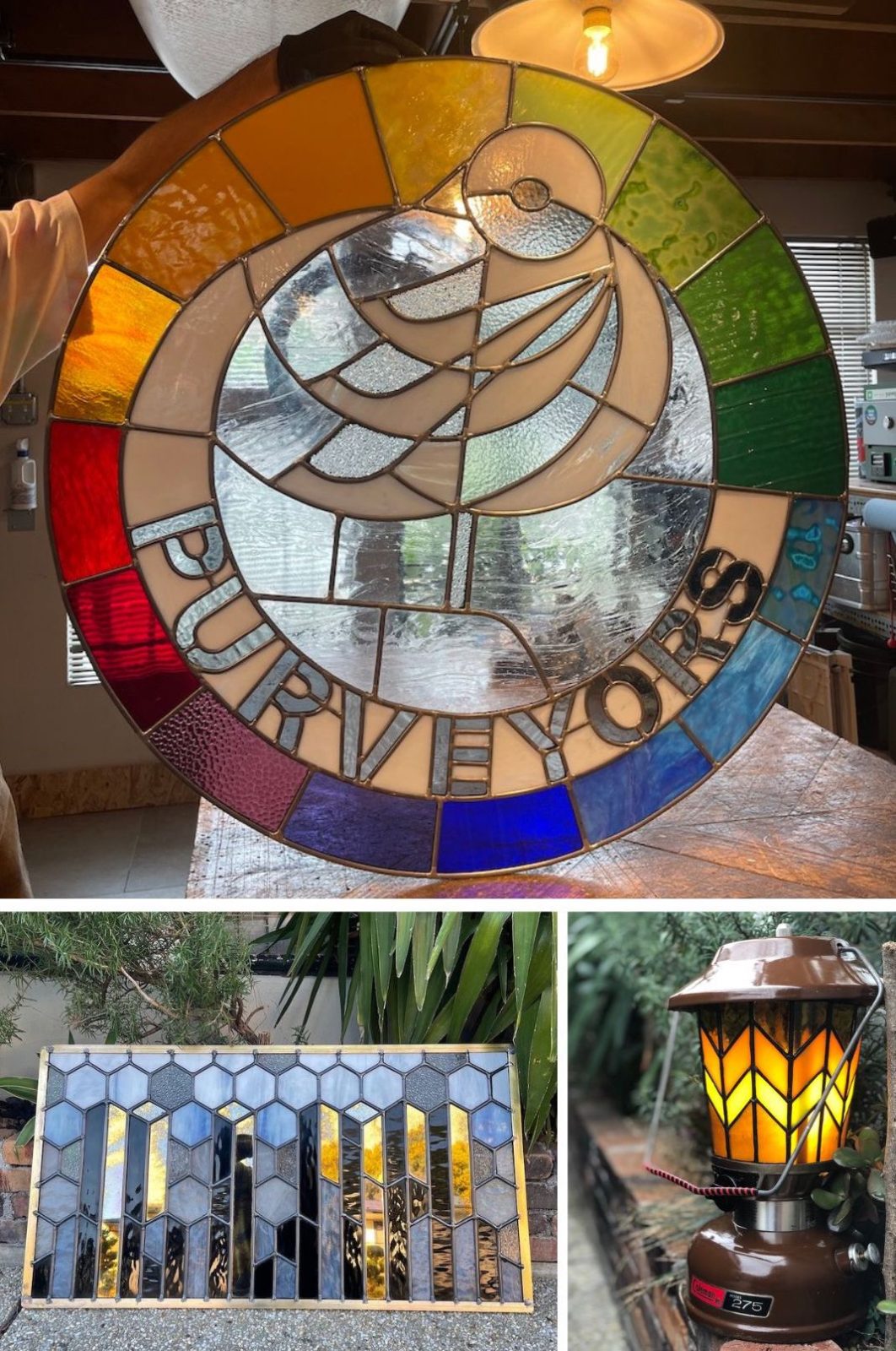 ▲群馬県桐生市にある旅やフィールドワークをコンセプトにしたセレクトショップ「パーヴェイヤーズ」。店のロゴをステンドグラスに(上)。北海道の温泉宿の窓。旅館の前にある柱状節理(マグマが冷却固結する際に六角形の大きな岩石柱になる)が連なる崖をモチーフに(下右)。古いランタンをリメイク。アウトドア用品にフィードバック(下左)。