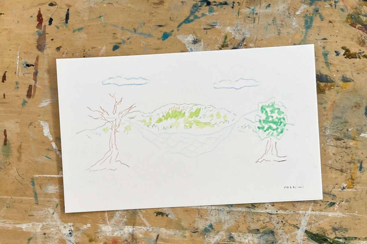 決意表明じゃないが、先日の「クライムオン!!2023」でとなりのブースになった伊藤佳美さんがその場で妄想山を描いてくるれるワークショップをやっていたので、弓立山とハンモックを描いてもらった。アウトドアタウンときがわ、なんだか見えてきた気がした。