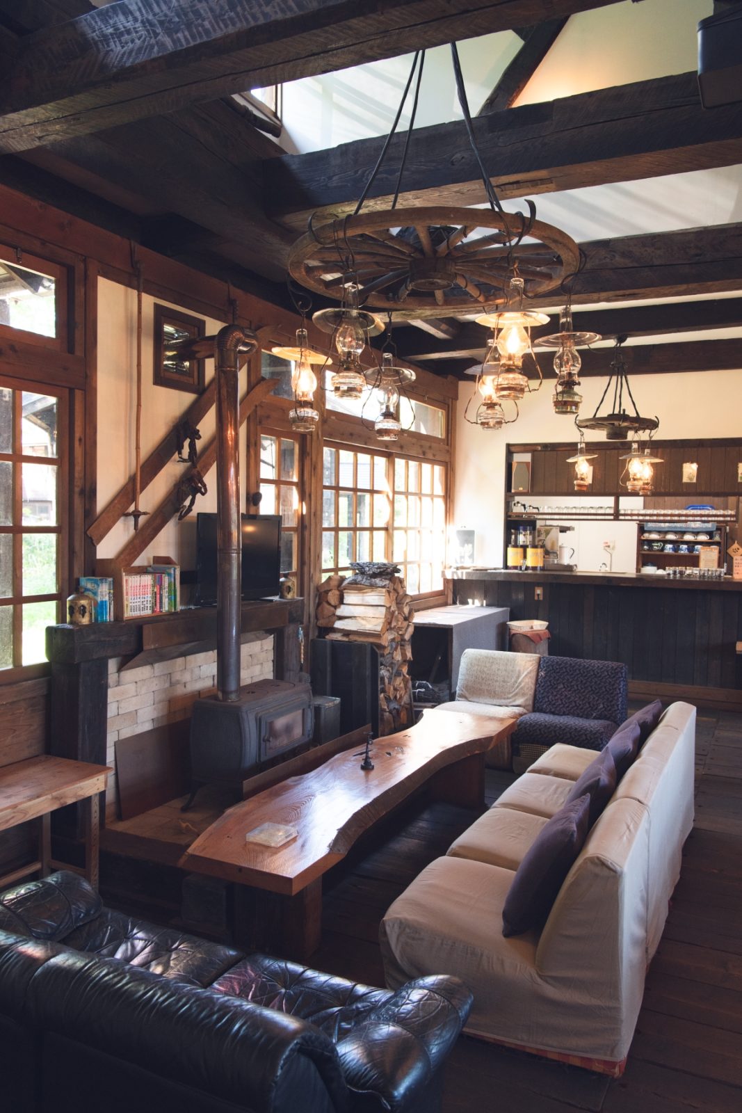 徒歩数分の場所に直営のカフェや売店があることも、この山小屋ならではの特徴だろう。本館の館内にもコーヒーをいただける談話室やお土産が購入可能な売店はあるが、本館とは別の建物内にカフェと売店があり、それらをめぐるだけで街歩きをしているような気分を楽しめる。カフェや売店で購入したものを、水辺に設置されたテラスでいただくもよし。山小屋にチェックインした後の時間や、翌朝の出発までの時間にめぐってみては。