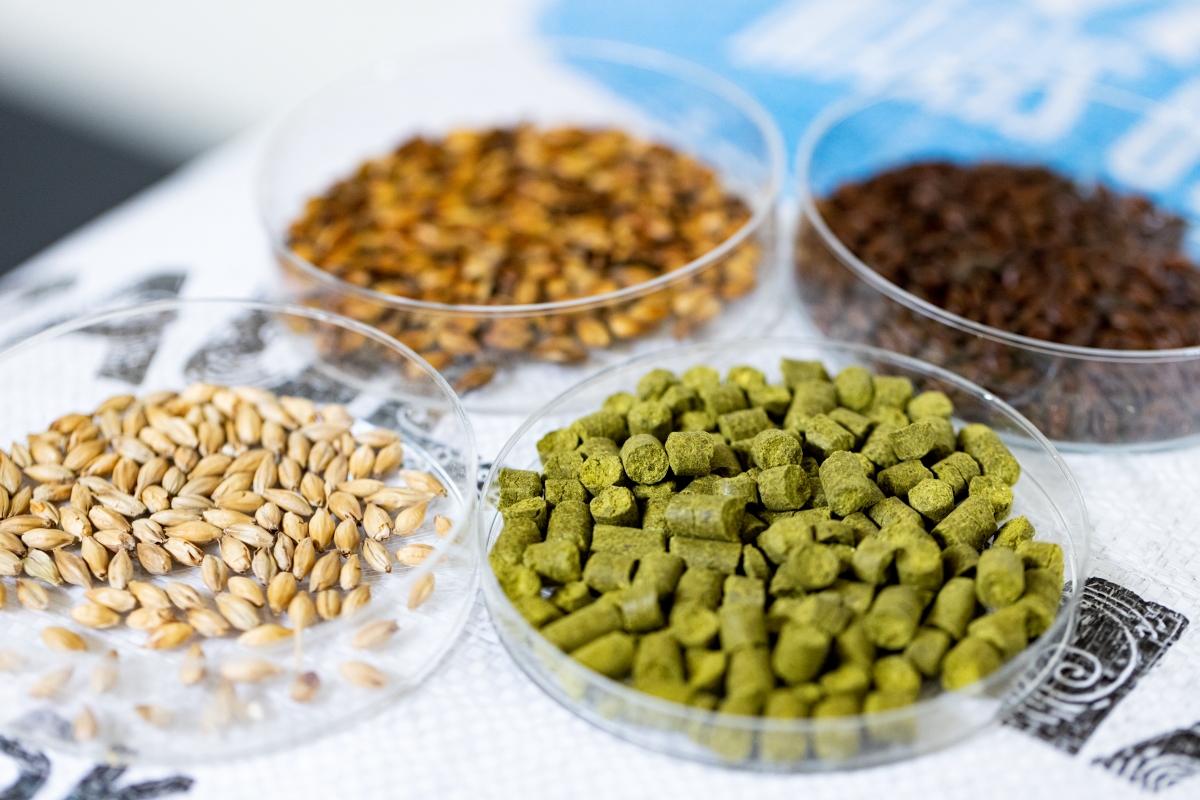 ▲手前はペレット状のホップ。奥の3 つが麦芽で、それぞれ焙煎の具合が異なる。