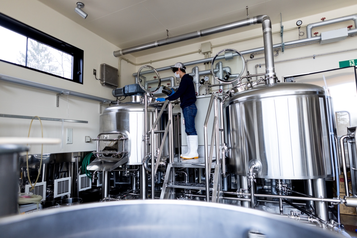 ▲左側の糖化窯をチェックしているのは、工場長の山岸さん。ビールは麦芽を破砕し、68℃で糖化させ、100℃で煮た後に冷却し、酵母を追加して発酵させて完成する。