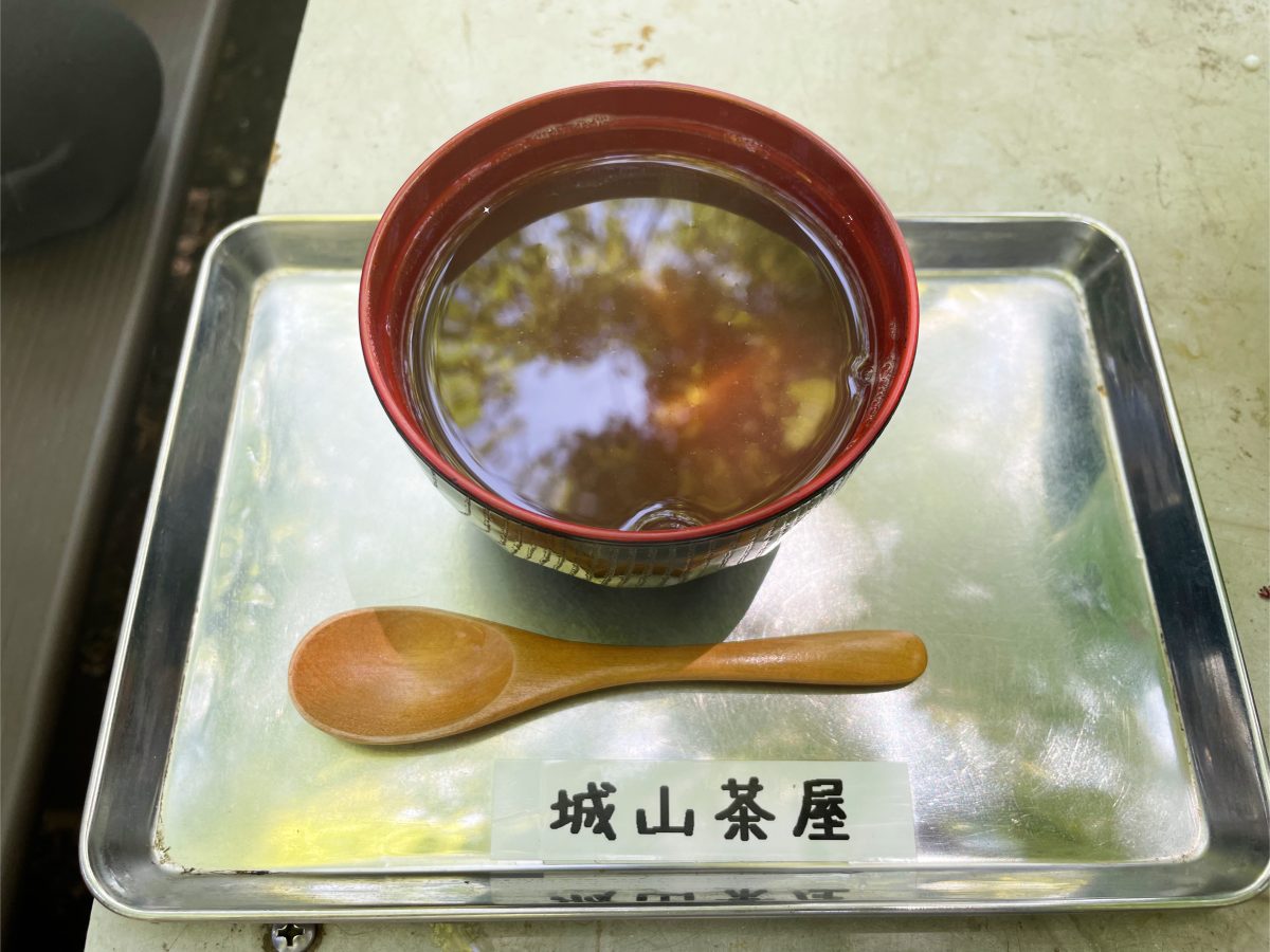 1時間ほど森を歩くと景信山の山頂に着いた。見晴らしもよく、ベンチやテーブルも広々として気持ちの良い空間。「頂上景信茶屋青木」という暖簾がかかる小屋もすてきだ。