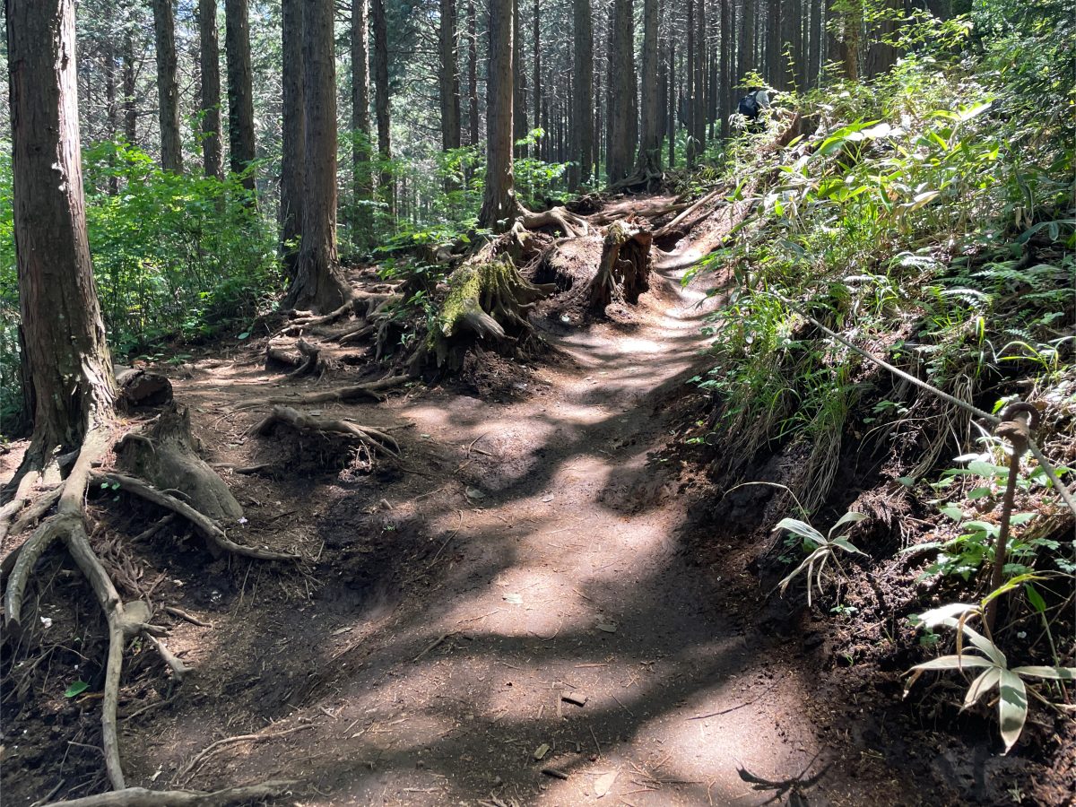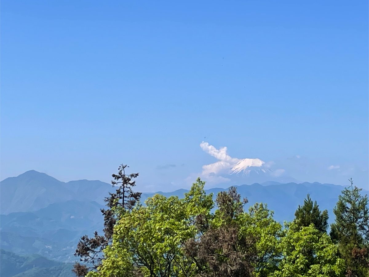 予定よりたっぷりと休憩を楽しんだあとは、再び森のなかへ。その道の先には富士山が見えた。