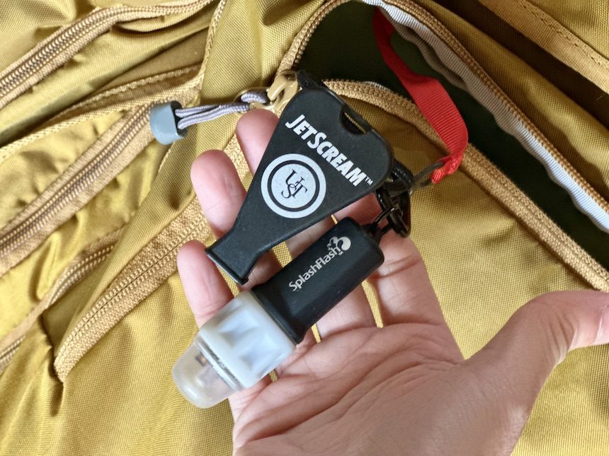 ホイッスルとライトはすぐ取り出せるところに収納、またはカラビナなどで取り付けておきましょう。