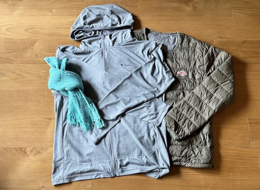 ストールもサッと防寒できるのと同時に、なにかを縛ったり、目隠しに活用したりと一枚あると便利。寒い時期の旅行では、小さくなる薄手のダウンなどもプラスできると安心ですね。