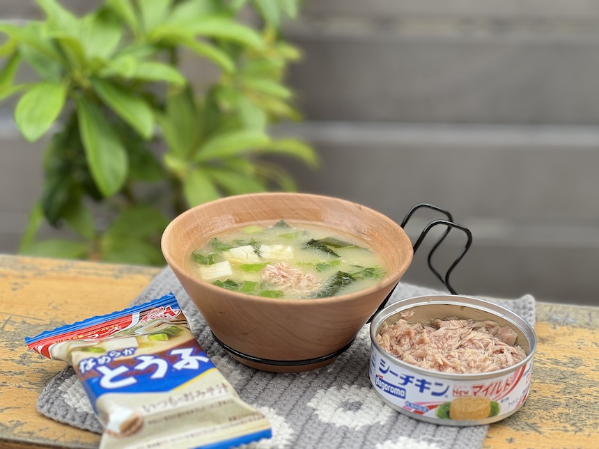 器にフリーズドライ(インスタント)味噌汁を器に入れて水を加えます。しっかりと味噌が溶けるまで混ぜたら、ツナを汁ごと入れて完成です。