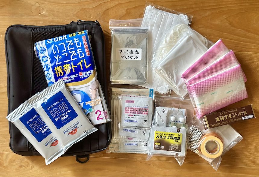 簡易トイレ/アルミブランケット/常備薬/救急セット/ティッシュ/ウエットティッシュ/マスク/ビニール袋/安全ピンや輪ゴムなどの文房具