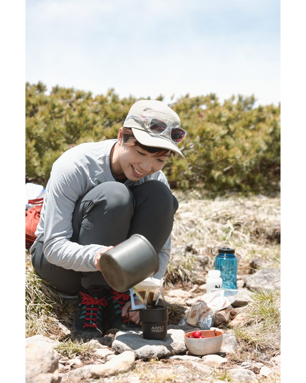 360度広がる眺望を愉しみながら、山頂で休憩している登山者同士で、「今日はいい日ですね」なんて声をかけあったり。自然体の奈緒さん。心の動くままに過ごす、束の間のひととき。