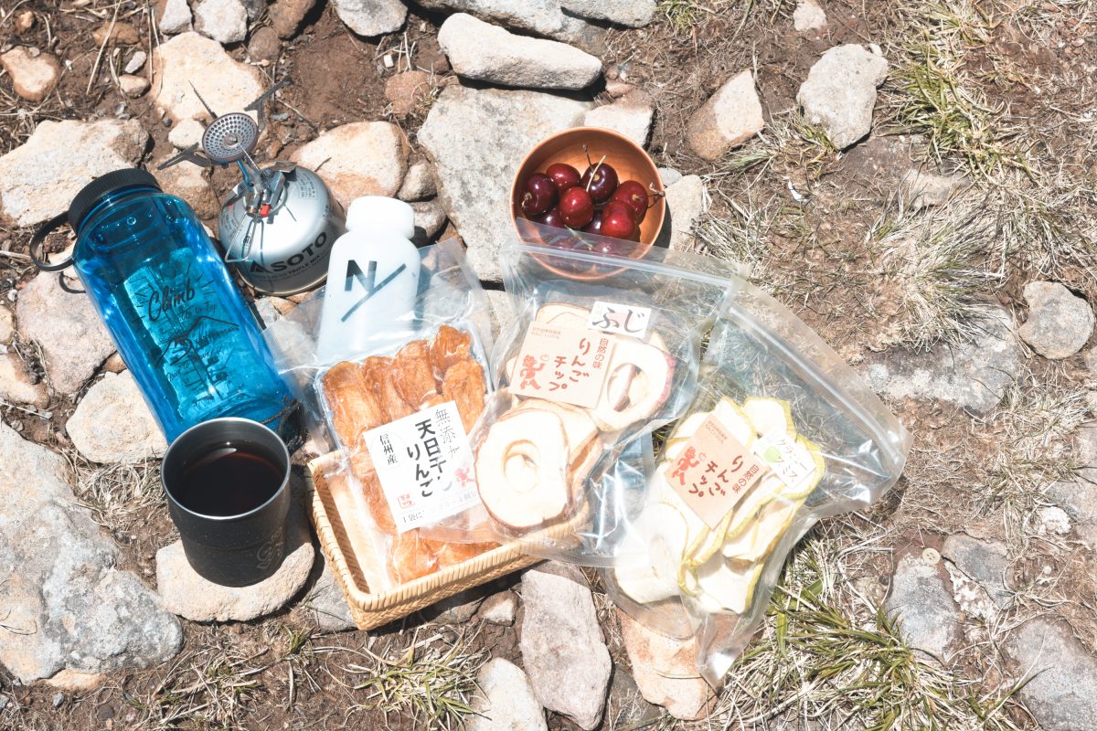 3種類のドライフルーツのりんごをいただきながら、おしゃべりを。家族との山の思い出、お仕事のこと、日々感じていること。