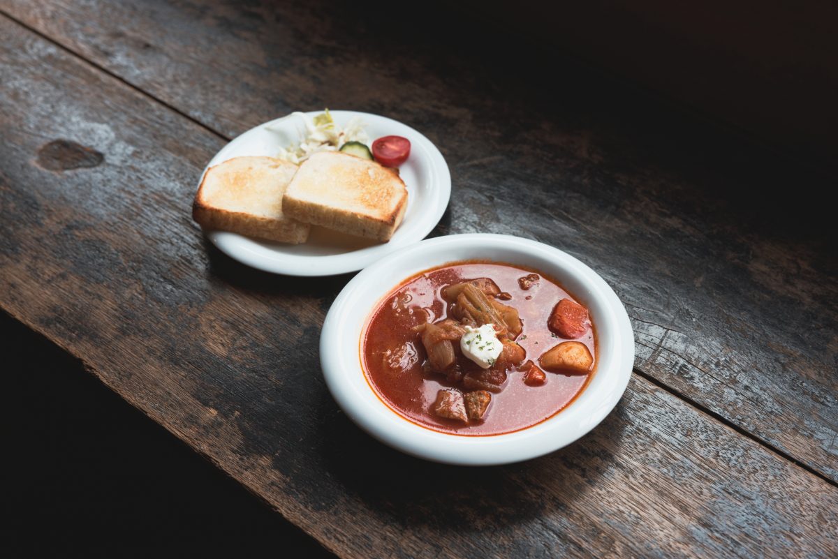 遅めのランチは、オーレン小屋名物のボルシチ。