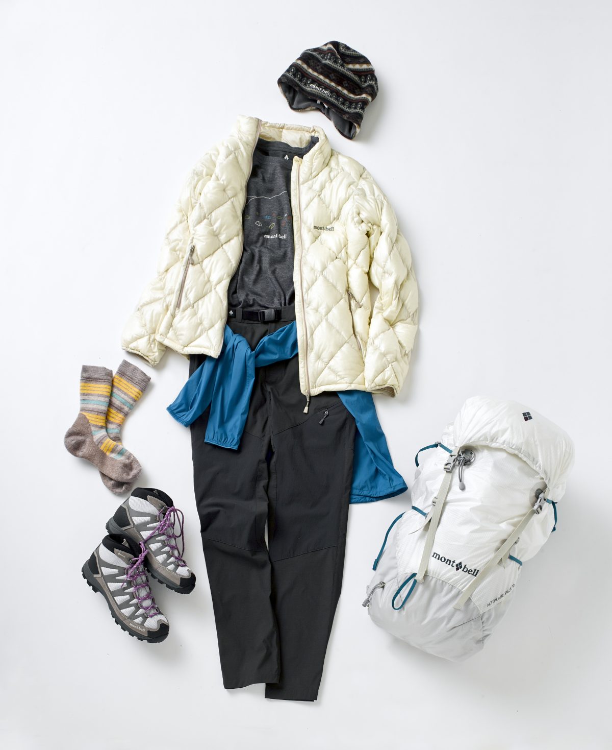 トップスやパンツをモノトーンでまとめたら、モンベルならではの鮮やかなカラーアイテムを差し色に。派手すぎないブルーは山コーデ初心者でも取り入れやすくておすすめです。ウエアがシンプルなぶん、柄ものの帽子や靴下で温かみや可愛らしさをプラスしては。