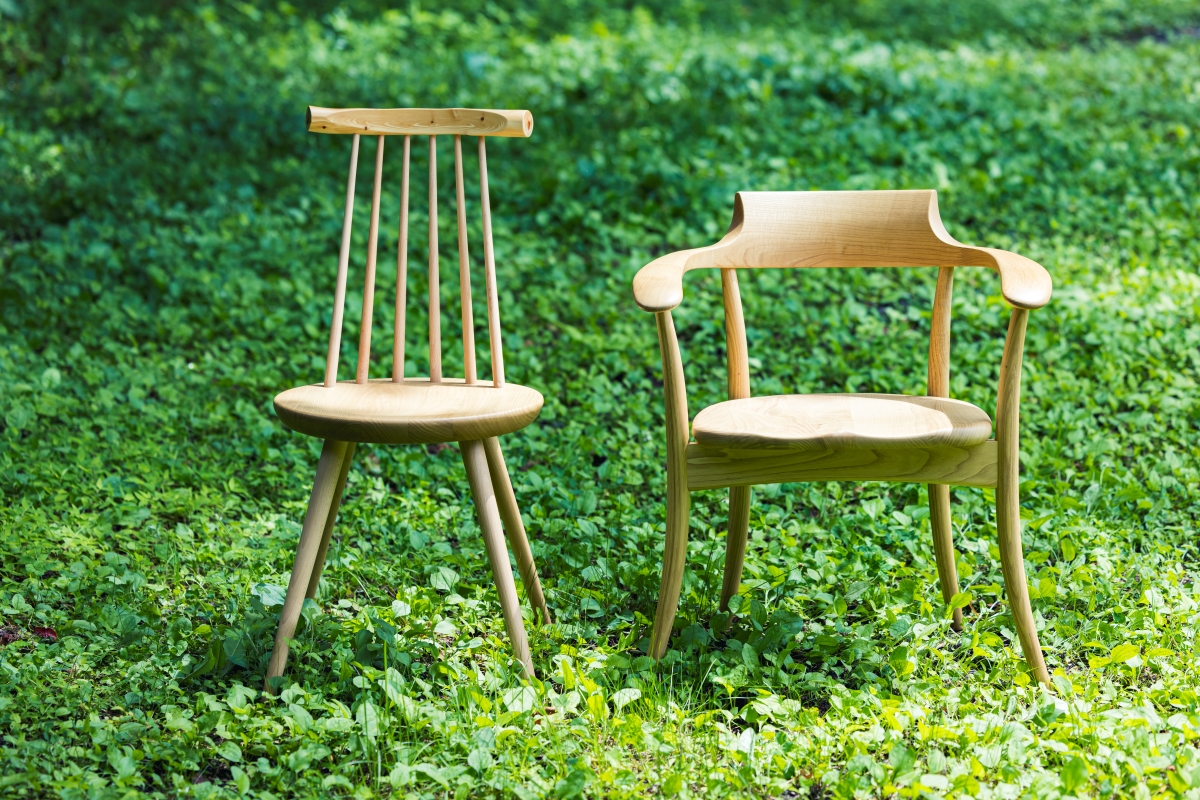 伐採した木を運び出す際に、切り落とし山に捨てられてきたスギやヒノキの枝が、背もたれの笠木として活用されている。そのほかの木材は国産のクリとブナを使用。枝の均一ではない自然なフォルムがアクセントに。63,800円
