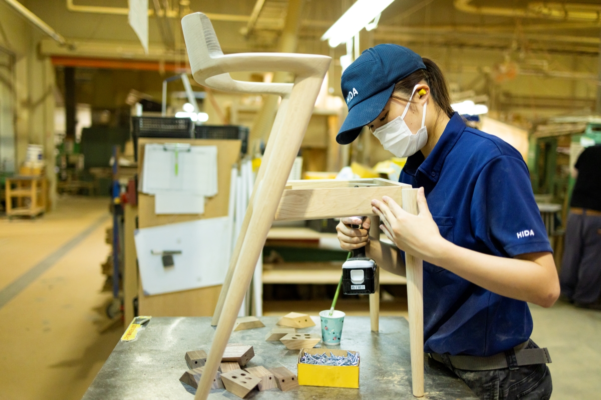 岡田さんは若手社員を中心に10名ほどのプロジェクトを作り、1年半をかけて企業理念を紡ぎ直した。最終的に「匠の心と技をもって飛騨を木工の聖地とする」というビジョンを〝志〞として表現し、志を実現するための4つの価値観を設定。ブランド名も「HIDA」に刷新した。4つの価値観のひとつに〝森と歩む〞があるが、家具に適さない小径の広葉樹を使用した「SUWARI」はその想いを具現化した一例だ。