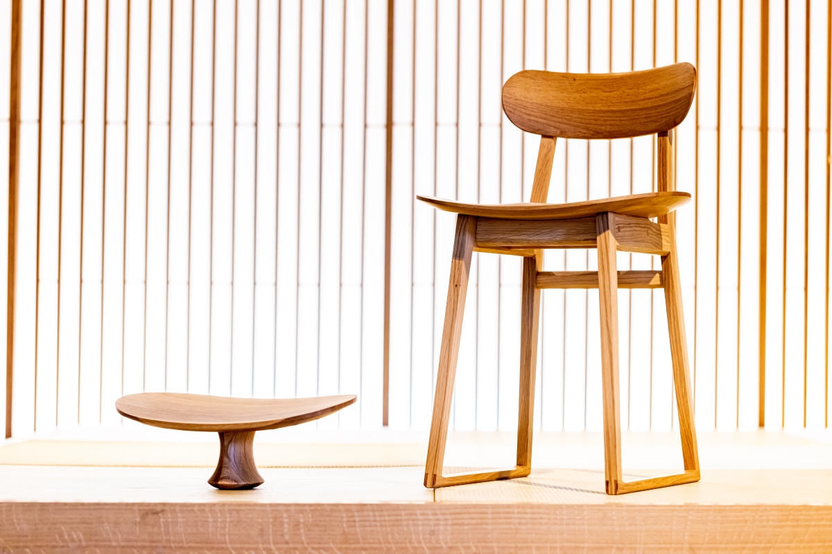 国産ナラの小径木を使用。チェアは細くて繊細かつ垂直方向の流れを意識してデザインされていて、和室にも現代建築にも合う。正座椅子は、長時間正座しても疲れない高さに設計されている。デザインは原研哉氏。27,500 円(左)、66,000円(右)