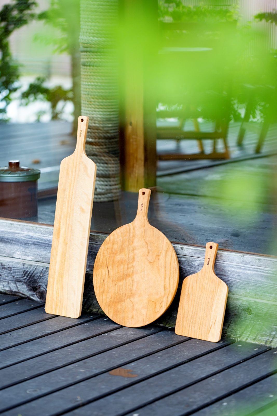 天然木のカッティングボード。サイズは小・中・大の3 種類あり。家具に使われなかった木材が用いられ、材種もそれぞれ異なる一点もの。キャンプやピクニックに持っていこう。4,620円(小)、9,460 円(中)、7,040円(大)