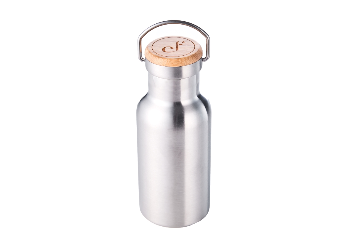保温・保冷性が高く、350㎖という容量は仕事場などでコーヒータンブラーとして使うのに、ちょうどいいサイズ感。取っ手付きなので、指にかけて持ち運びしやすい。本体はステンレス、蓋は手になじむ竹製のため、リサイクルも可能。