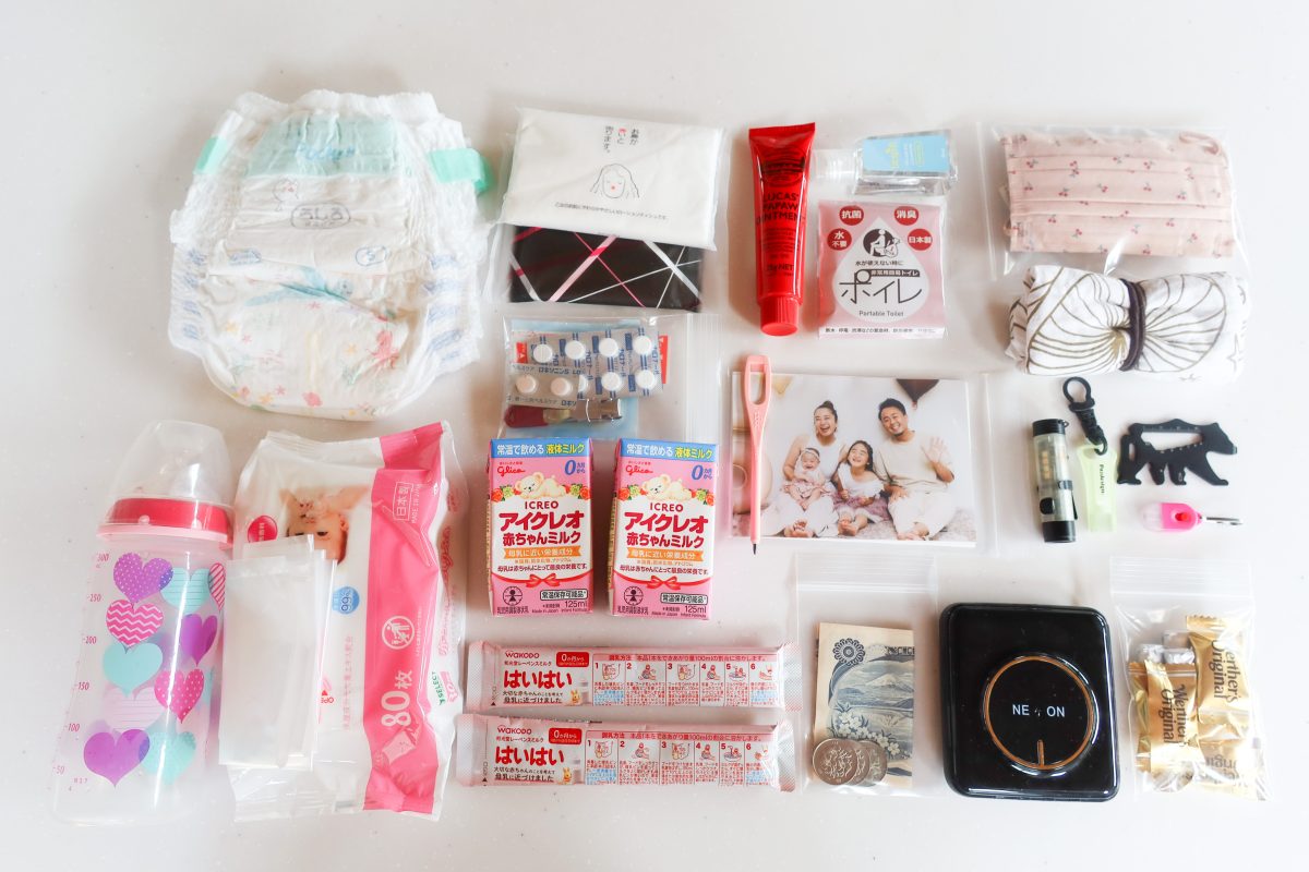 貴重品:現金、家族写真(身元情報記載)、母子手帳・医療書・保険証のコピー