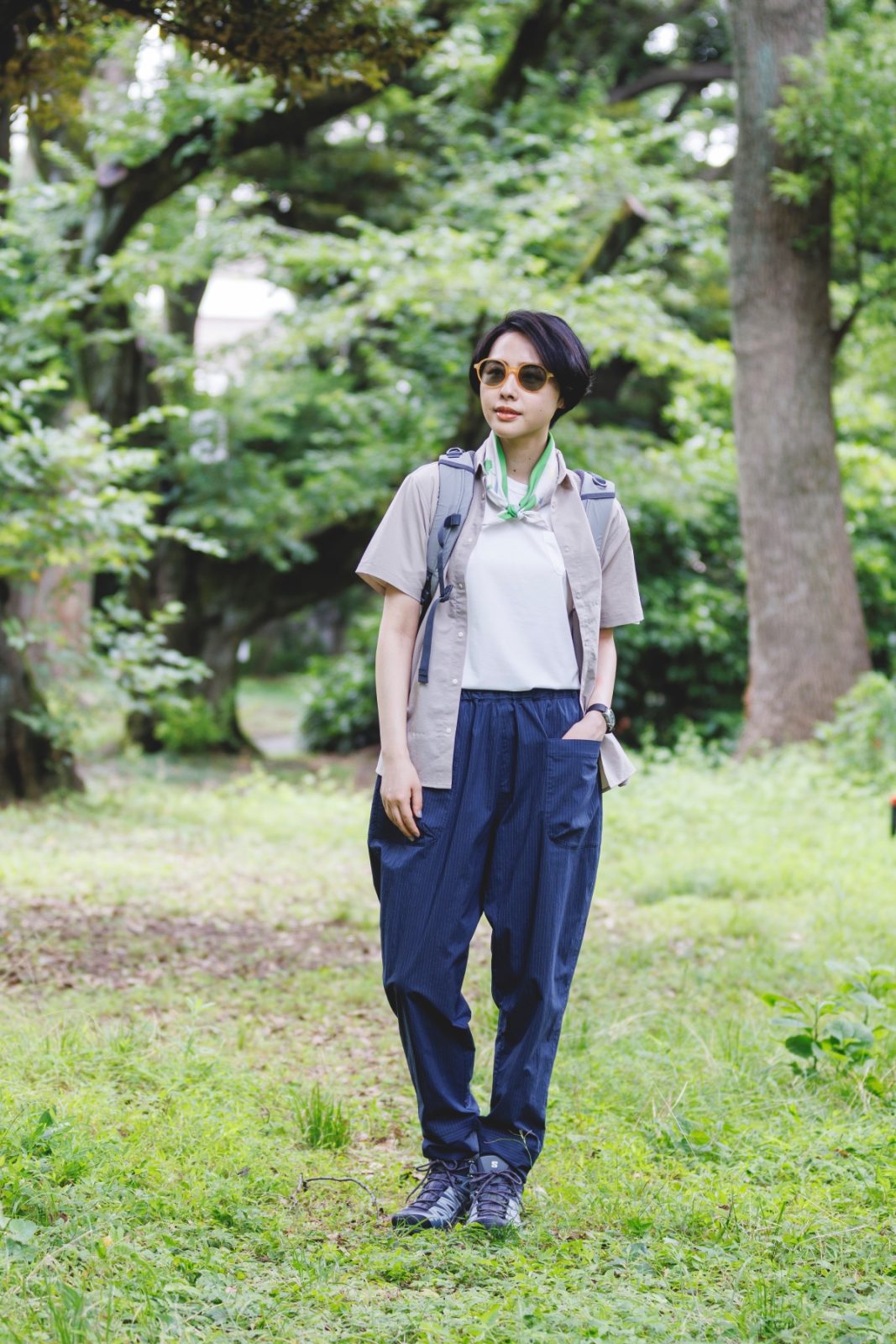 ▲街から低山へ。ワンピースとの相性がよい、T シャツとショートパンツの上に羽織った軽やかなスタイル。日常で着ていても違和感なく、一枚でさまざまなシーンや表情を楽しめる。