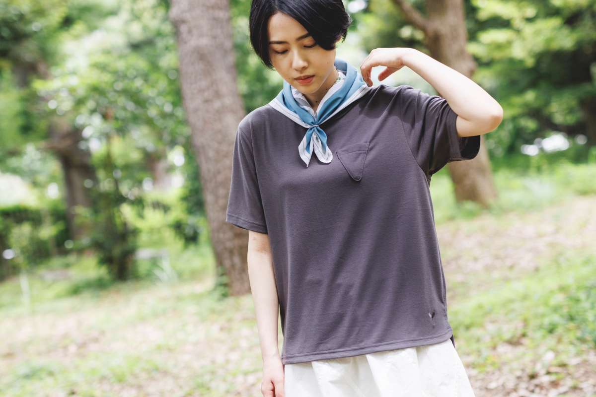 ▲シックなネイビーグレーのT シャツにセットのバンダナを巻くだけで、女性らしい印象に早変わり。