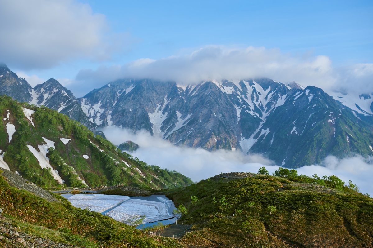八方池と白馬三山。リフトを降りてからたった1時間30分で出会えるこの絶景!真夏になると氷がとけ、水面に山々が映し出される様もとても美しいです。