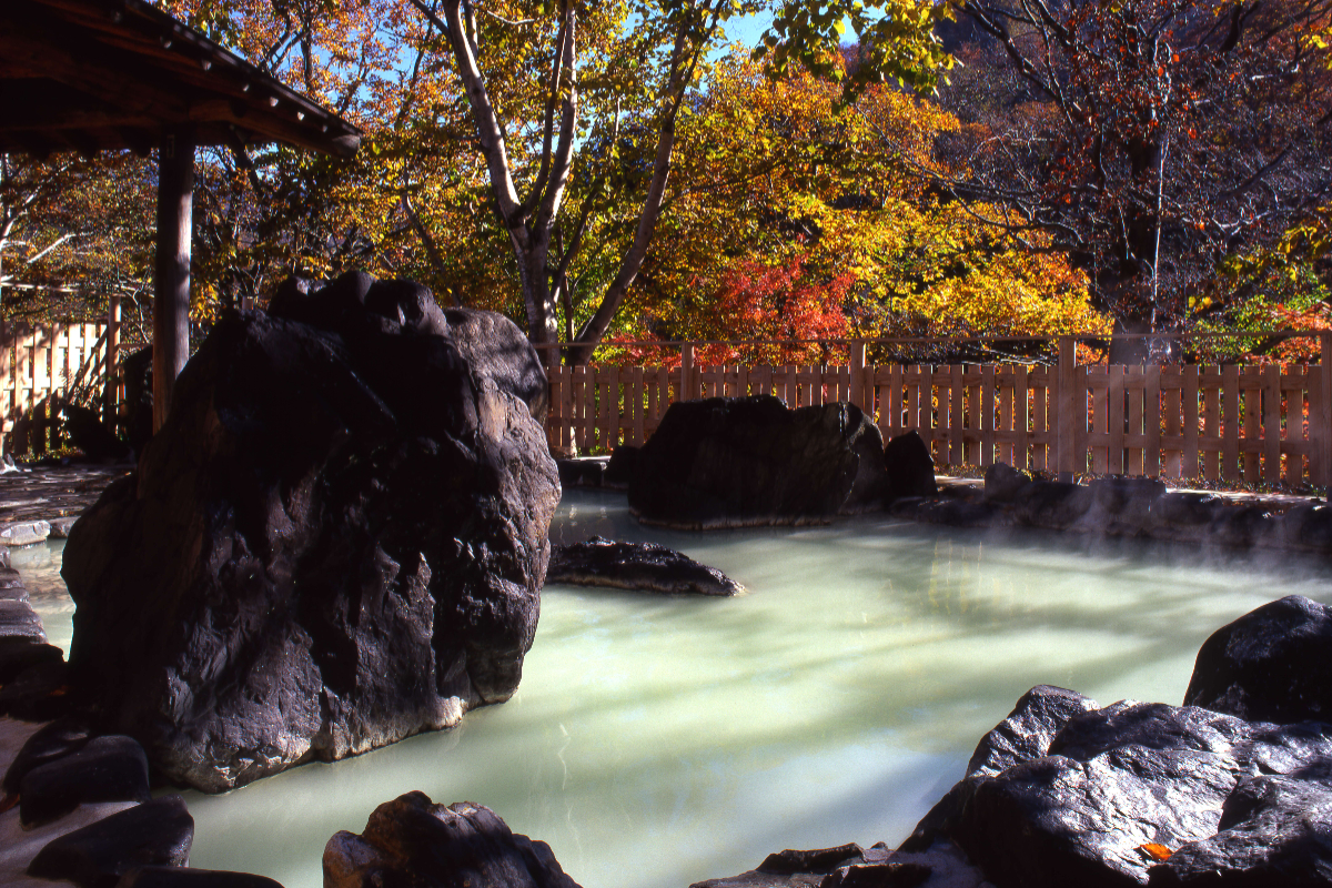 山頂付近の紅葉が始まると、紅葉と朝焼けに照らされることにより、乳白色の湯がオレンジ色に染まることも。自然が生み出した雄大な景色を拝みながら、温泉を楽しむことができます。
