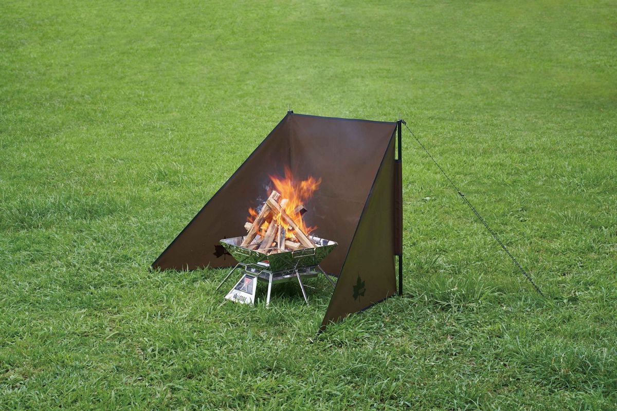 生地に難燃性の高いポリコットンを採用しているため、焚き火の火の粉対策はバッチリ。撥水と防カビ加工を施してある点も、うれしいポイントです。ポールは、地面にしっかり刺せるスチール製なので安定感も抜群。横幅が広く、焚き火台を囲うように設営できるので、しっかりリフレクターとしての役割を果たしてくれます。