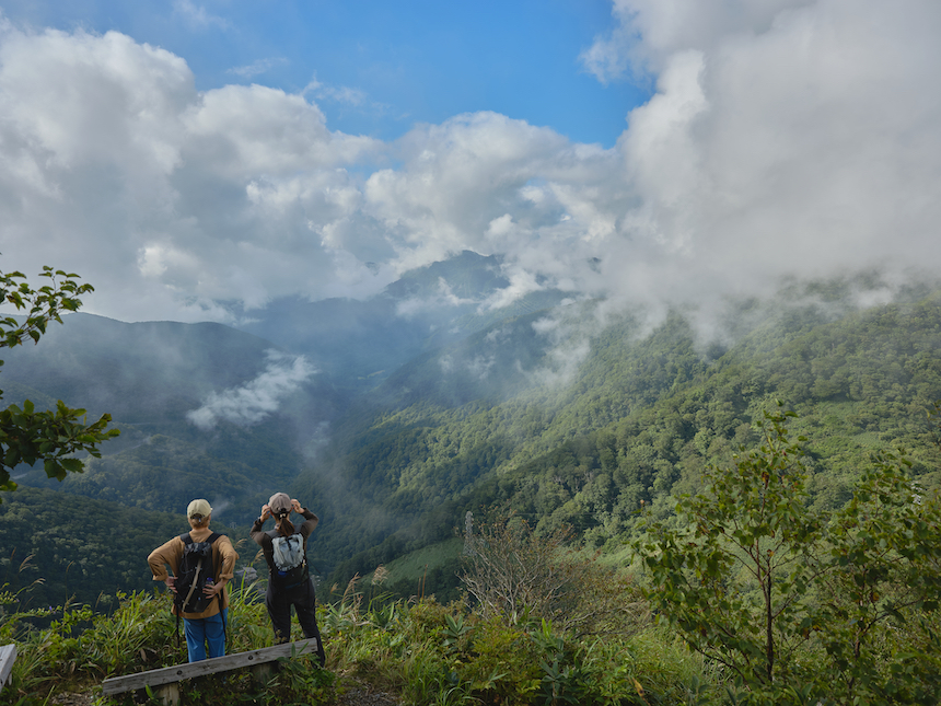 歩き始めておよそ50分。鳥居を構えた社を右に進むと、視界が開け始めた。カラフルな高山植物や、眼下に広がる山並みに心が踊り、足取りも軽くなる。しばらくすると、日光がたっぷりと注ぐ明るい道に到着。すると、群馬と新潟の山の大パノラマが左右に広がった。近くに浮かぶ雲も手伝って、まるで天空を歩いているかのよう。バックパックを下ろすと涼しい風が服の中を通りぬけて、体のほてりが和らいだ。