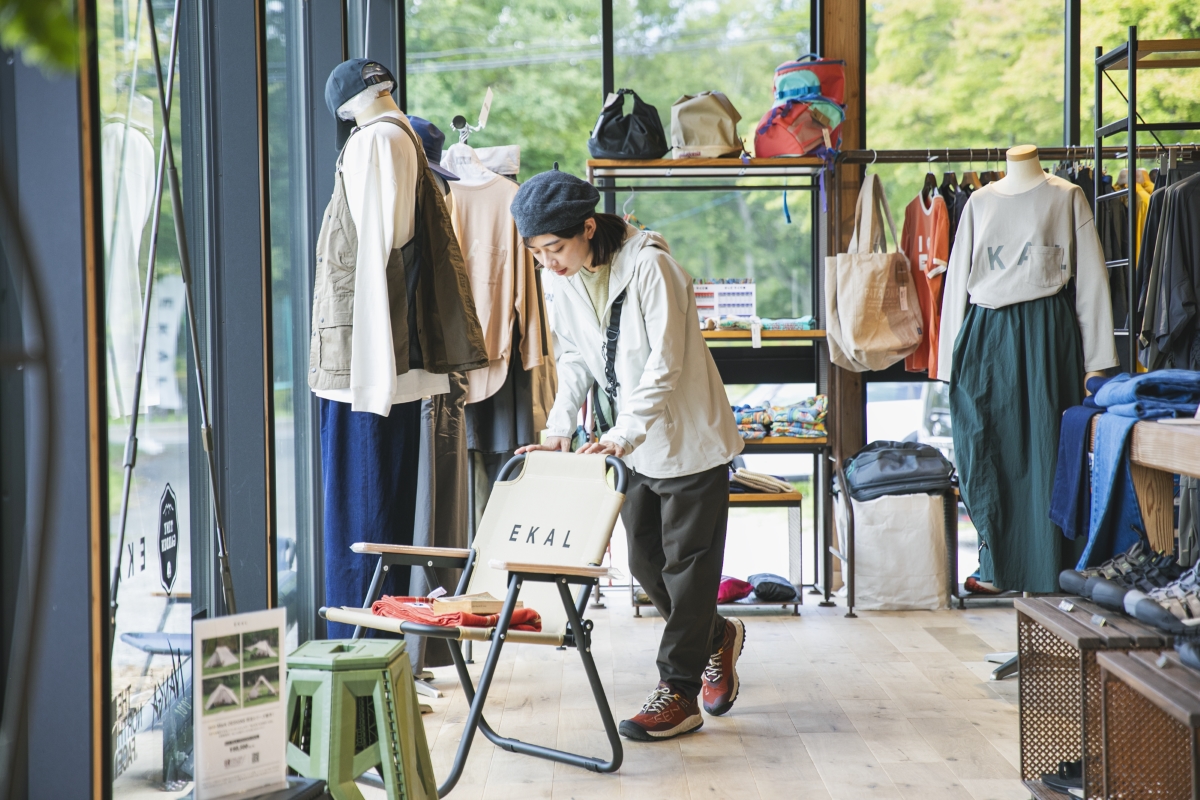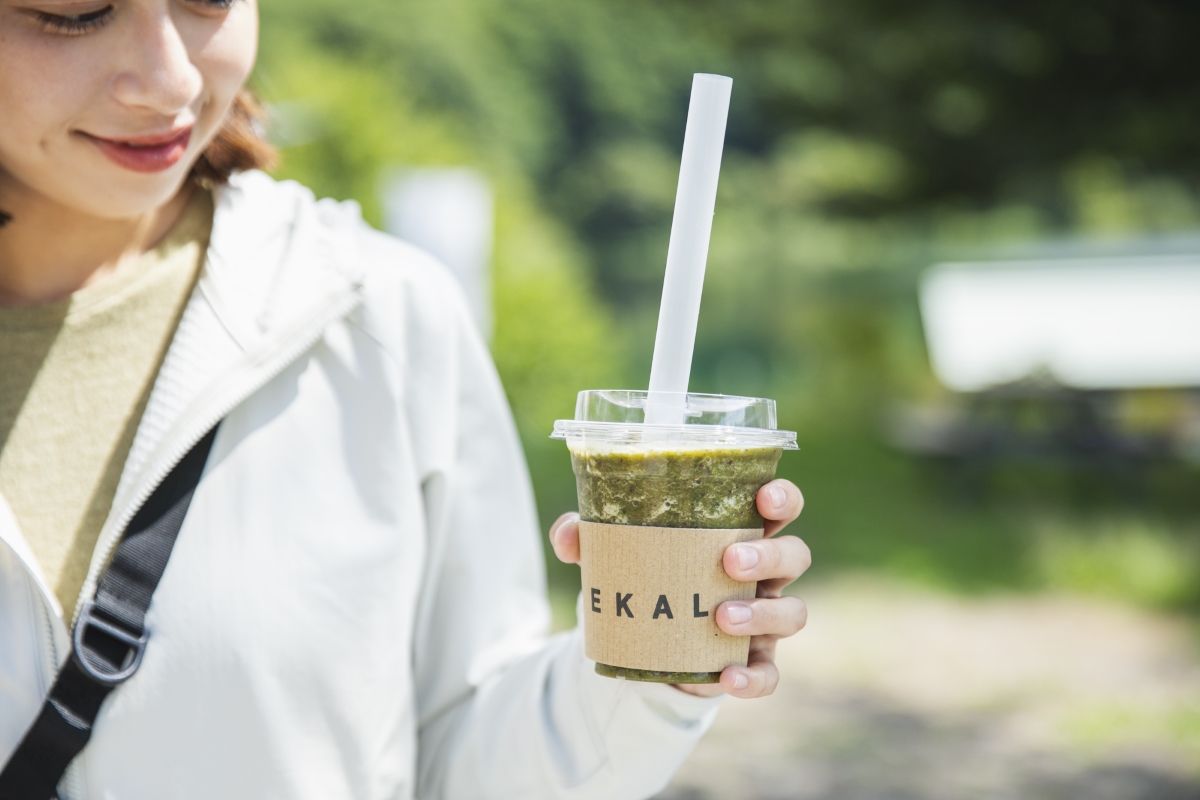 美しい自然に囲まれた、蓼科湖畔の近くに佇むカフェ&アウトドアショップ。外あそびにぴったりのギアや、普段使いしやすいアイテム、オリジナルブランドの商品まで幅広く展開している。施設内にあるカフェメニューはすべて手作りで、なかでもとくに人気なのが、地元野菜のグリーンスムージー(918 円)。地元生産者から取り寄せた規格外の野菜がたっぷりと使われていて、とてもおいしい!