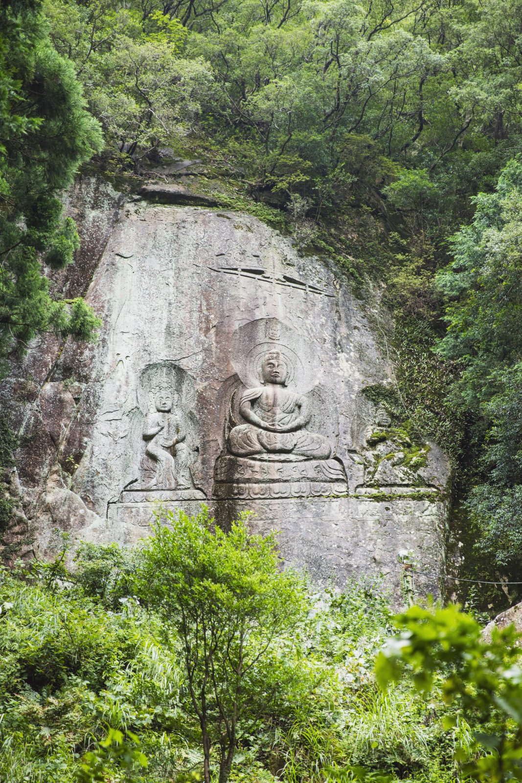 ▲迫力の磨崖三尊大石仏。高さ16mにおよぶ巨大な岩壁に刻まれている。
