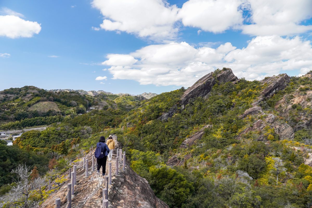 ▲歩き応えのある道のりと、海・まち・山の絶景が人気の高尾山。もろい岩質が特徴の「東展望台」は、まるで山上のビーチ。紀伊半島らしい山深い眺めが広がる。