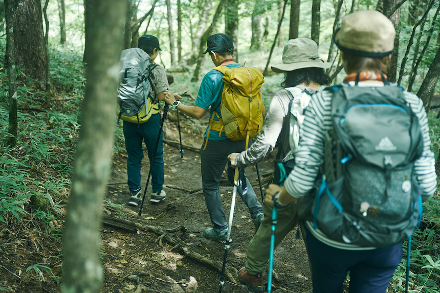 体の使い方や山道具の選び方など、女性ならではの視点でていねいに教えてくれる。おいしいもの好きでも有名で、下山後に寄りたい飲食店にも詳しい。男性と比べて筋力が弱い女性はとくに縦走や下山時などにトレッキングポールを使用することをすすめている。個人的には短めに使うのが好み。