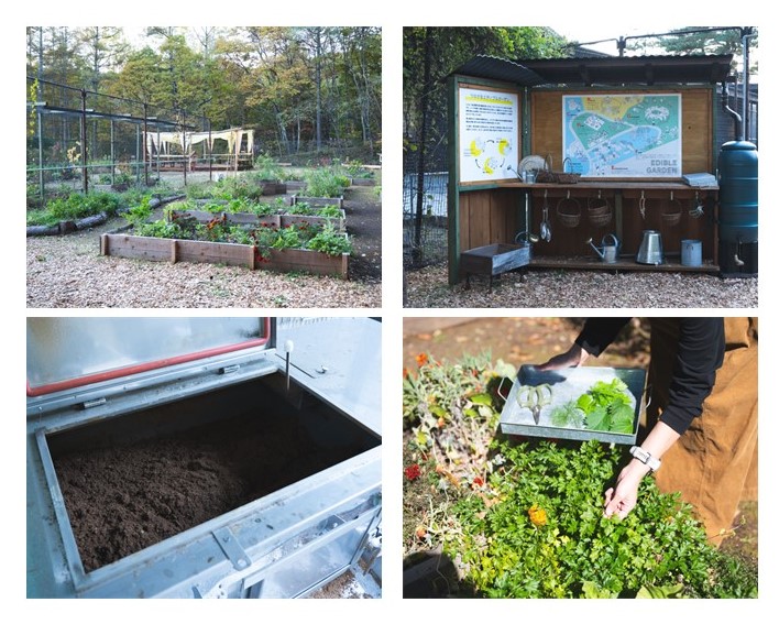 先述のとおり、東急リゾートタウン蓼科は森に囲まれたリゾートですが、2012年にリゾート内で起こった大規模な土砂崩れをきっかけに森づくりの重要性に気づき、間伐や広葉樹の植林など人工林の管理に着手しはじめました。間伐した木材は、バイオマスボイラーの燃料やアロマグッズなどの原料として活用しているそう。コンポストを設置してレストランの生ゴミを堆肥化しているのも、サスティナブルな取り組みのひとつ。リゾート内にある「エディブルガーデン」には、その堆肥を使って野菜やハーブが育てられています。