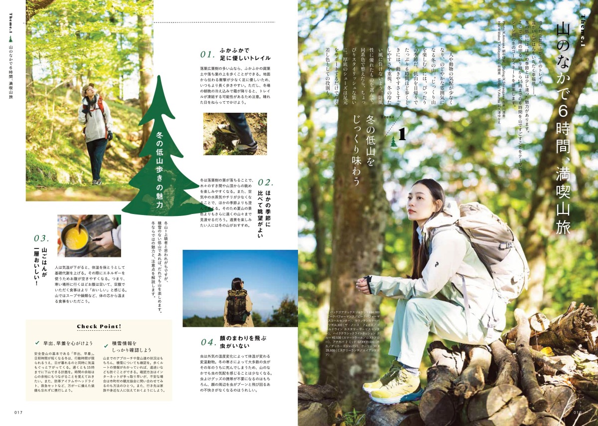 今号では、そんな冬の低山歩きを、おしゃれで快適に楽しめるコーディネートを、山の楽しみ方別にたっぷりとお届け!冬の低山だからこそのノウハウも紹介しています。