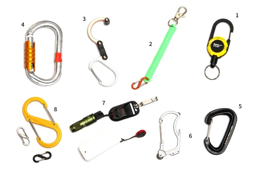 最後に優秀なアクセサリーカラビナ(8)を紹介。こちらはふたつゲートが特徴で脱着する側と固定する側で分けて使うことができます。マイクロサイズのカラビナから特大サイズ、樹脂・アルミ・ステンレスなど素材違いやロックの有無などさまざまなタイプが選べます。いちばん小さなサイズとピークデザインのアンカーは相性がよく、ふたつを組み合わせて使用しています。