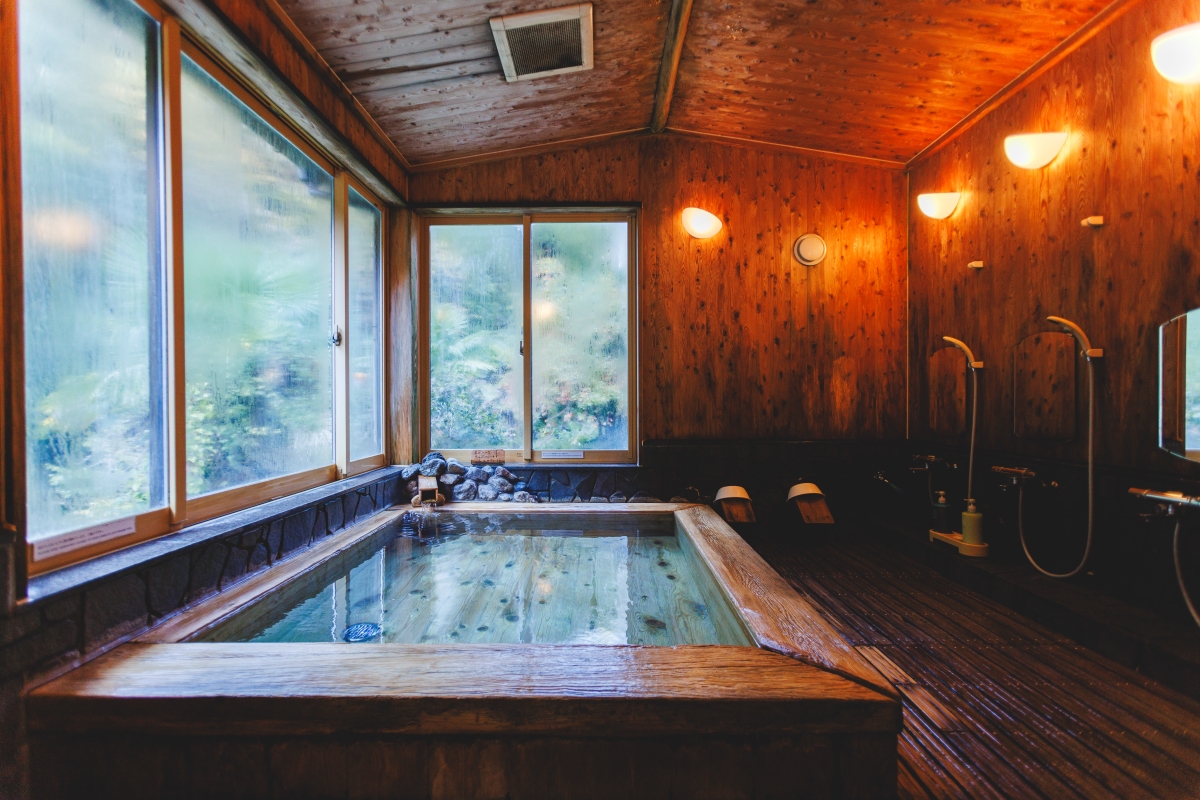 その昔、弘法大師が夢に現れた龍王のお告げによって開かれたと伝えられ、紀州徳川家との縁も深い龍神温泉。山に囲まれた渓谷を眺めながら温泉に癒やされよう。なめらかなお湯で、浸かればお肌がすべすべ、体の芯から温まる。檜の内湯のほか露天風呂もあり。