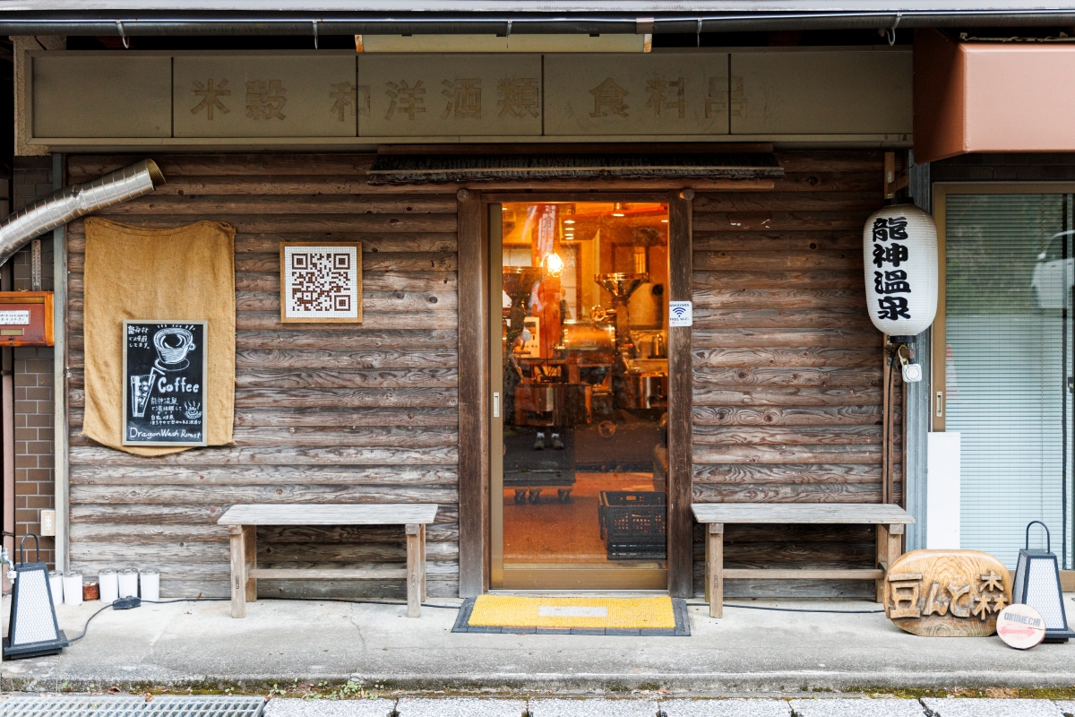 トレイルランナー中川政寿さんが、龍神温泉街で唯一残っていた喫茶店の閉店を機に引き継ぎ、オープンした焙煎所兼カフェ「豆んと森珈琲」。龍神村の休耕田で自ら栽培したサツマイモを使った地ビール「龍神金熊」を商品化するなど、地域の魅力を発信する拠点を目指している。