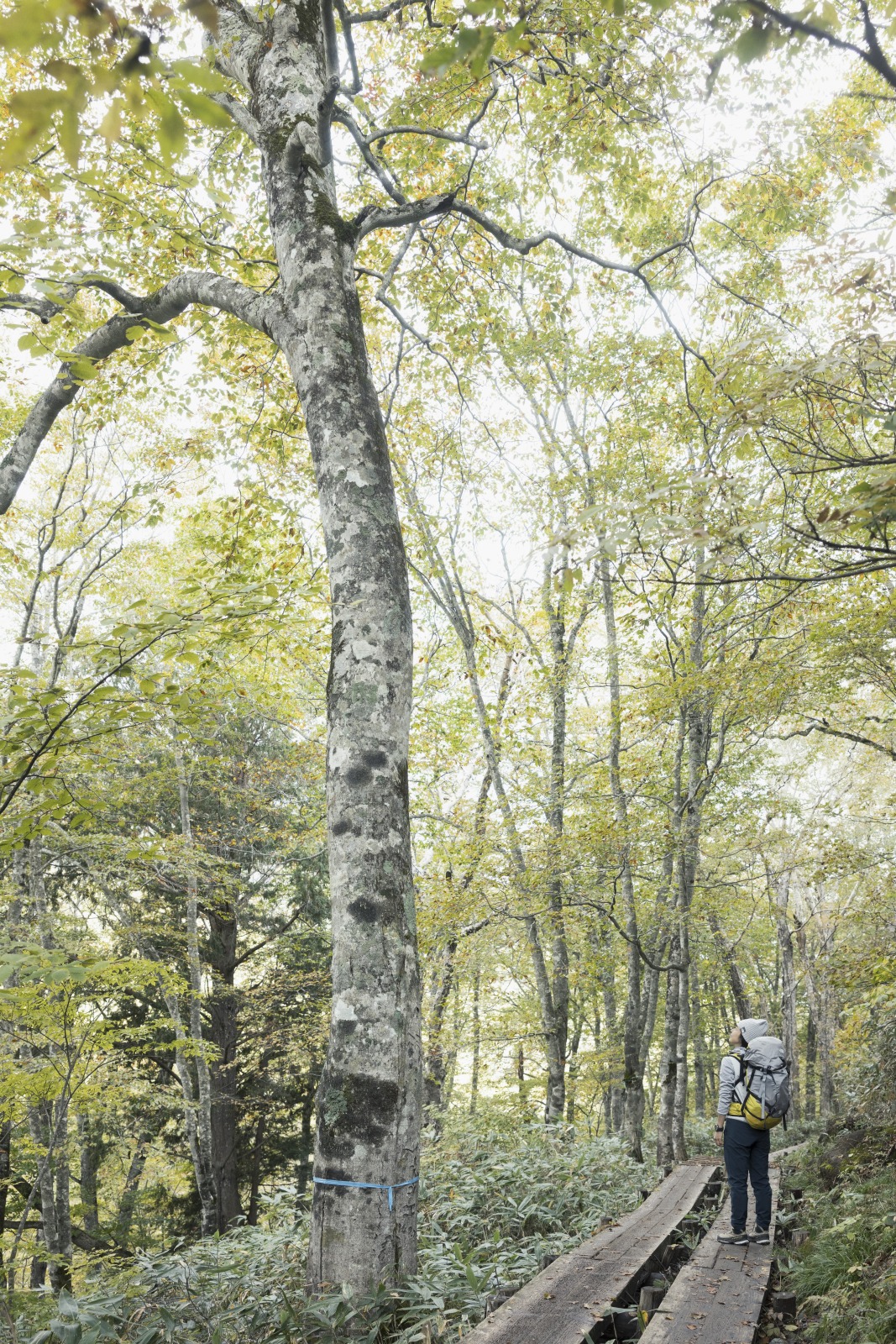 「湿原のイメージが強い尾瀬ですが、豊かな原生林が守られていることも尾瀬の魅力のひとつ。これほど大きなブナやカラマツが残された風景は、『日本の自然保護運動発祥の地』と言われる尾瀬ならではだと思います。森の暮らす生き物たちの気配も濃くて、人が少ない日にはオコジョが姿を現すこともあるんですよ」とガイドの渡辺佐智さん。中央分水嶺の鳩待峠から始まった水の流れを感じられることも、このルートのおもしろさだという。