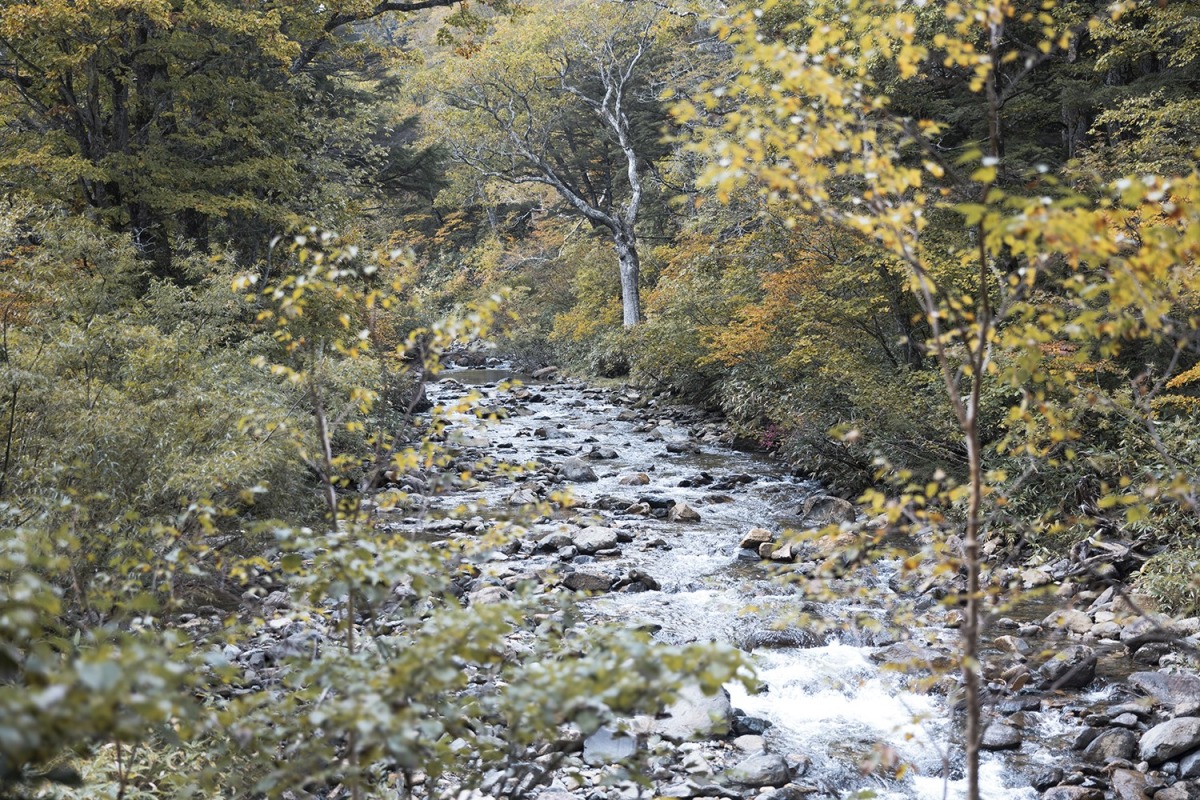 標高1591mの鳩待峠から標高約1410mの山ノ鼻へ。川上川沿いのルートは、豊かな森に包まれている。序盤の急な下りを過ぎると傾斜は少しずつ緩やかになり、穏やかで気持ちのいい樹林帯歩きの時間が続く。
