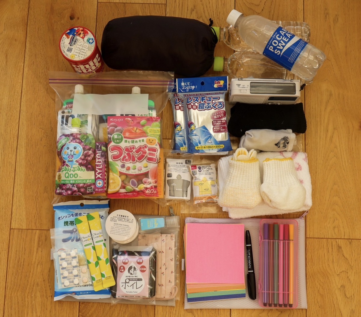 衛生用品:(ファスナーバッグにひとまとめ)常備薬、救急セット、保湿剤、口内ケア類、マスク、トイレ、虫刺され類、生理用品、ドライシャンプーなど