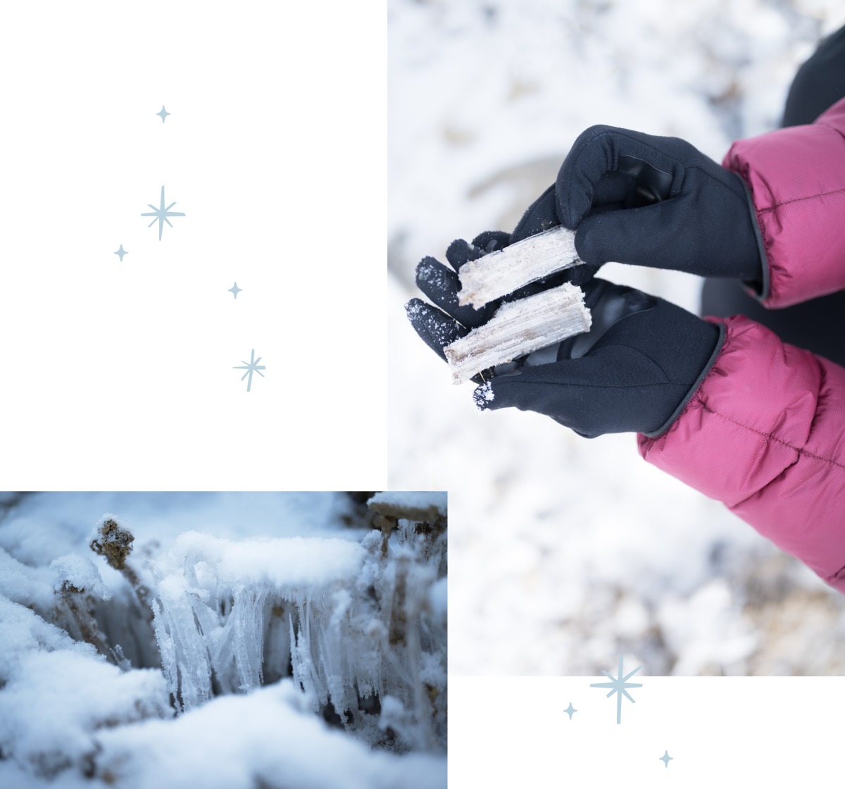足元で静かに輝く霜柱、花や葉を落とし次の季節をじっとまつ植物たちの姿、絶え間なく流れる風と雲……。いまそこにある自然を自分たちのペースで楽しみながら、ゆっくりと進んでいく。